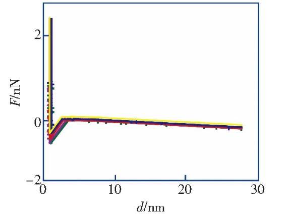 筆者利用原子力顯微鏡實驗測量了HOPG表面在醇-水替換前后的力距離曲線,發(fā)現(xiàn)醇-水替換前進針曲線的跳進距離小于5 nm,滿足DLVO理論;而在醇-水替換后納米氣泡覆蓋率為21.8%的情況下,進針曲線的跳進距離均大于10 nm,不能再用DLVO理論解釋,證明了IGE與納米氣泡共存這一現(xiàn)象。根據(jù)改進的Laplace-Young方程,結合文獻中對納米氣泡線張力值的計算結果,分析負的線張力對過渡區(qū)內(nèi)局部表面張力及局部固-液界面的影響,導致納米氣泡的接觸角反常小的原因之一。分析并討論雜質對納米氣泡接觸角的影響,指出IGE與納米氣泡共存、線張力及雜質影響的共同作用是導致納米氣泡接觸角“反常小”的原因。