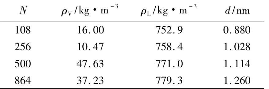 在溫度500 K和截斷半徑rc=0.9498 nm的條件下,當模擬分子數N=108、256、500和864時,模擬得到的密度分布見圖9。統(tǒng)計得到的汽相主體密度ρV、液相主體密度ρL及汽液界面厚度d見表5。