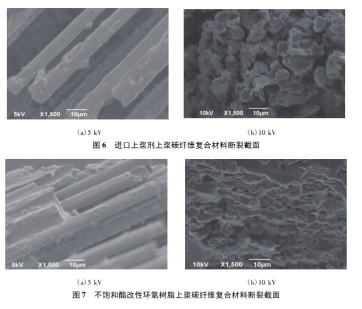 復(fù)合材料斷裂截面圖顯示,采用進口上漿劑制備的碳纖維在部分區(qū)域未能有效吸附上漿劑組分,出現(xiàn)纖維的滑脫和粘連等不良現(xiàn)象。采用不飽和酯改性環(huán)氧樹脂上漿劑制備的碳纖維表面均勻涂覆上漿劑高分子,并與酚醛基體樹脂粘結(jié)成一體,纖維很難從樹脂中滑脫,界面結(jié)合性能良好。測試結(jié)果表明,不飽和酯改性環(huán)氧樹脂上漿劑能有效改善上漿碳纖維與不同基體樹脂的適用性,具有更好的通用性。