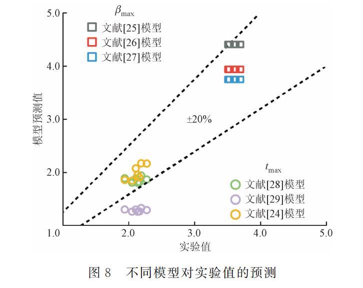 式中:tmax,pre和βmax,pre為使用各模型的最大鋪展時間和最大鋪展因子預(yù)測值;tmax,exp和βmax,exp為最大鋪展時間和最大鋪展因子實驗值。如圖8所示,不同公式的預(yù)測結(jié)果不同,對于最大鋪展因子,盡管不同學(xué)者提出的表達式對實驗結(jié)果的預(yù)測準(zhǔn)確率均較好,單個數(shù)據(jù)點的偏差均在20%以內(nèi),然而由于表達式的限制,無法針對液滴沖擊不同水平壁面過冷度的實驗工況進行預(yù)測,存在一定缺陷。對于最大鋪展時間,Huang和Chen等人提出的表達式預(yù)測效果較差,Wildeman等提出的表達式預(yù)測效果較好,相對平均偏差為12.32%,但由于其表達式內(nèi)不包含水平壁面過冷度的影響因素,因而預(yù)測效果略差于Shang等提出的表達式,其相對平均偏差為6.05%。綜上所述,現(xiàn)有最大鋪展時間的表達式能較好預(yù)測乙醇液滴沖擊過冷水平壁面的鋪展動力學(xué)行為,但最大鋪展因子表達式仍需進一步探索。