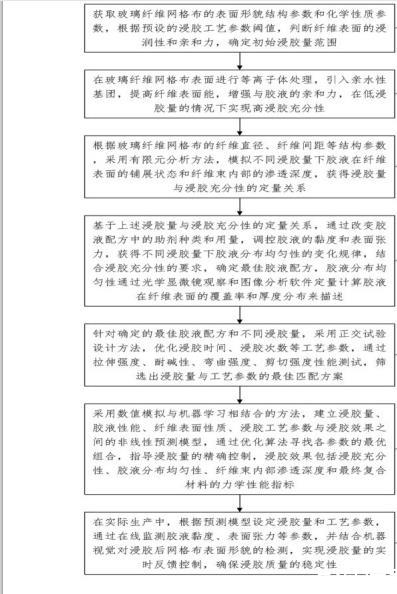 獲取玻璃纖維網格布的表面形貌結構參數和化學性質參數,根據預設的浸膠工藝參數閾值,判斷纖維表面的浸潤性和親和力,確定初始浸膠量范圍;在玻璃纖維網格布表面進行等離子體處理,引入親水性基團,提高纖維表面能,增強與膠液的親和力,在低浸膠量的情況下實現高浸膠充分性;根據玻璃纖維網格布的纖維直徑、纖維間距等結構參數,采用有限元分析方法,模擬不同浸膠量下膠液在纖維表面的鋪展狀態和纖維束內部的滲透深度,獲得浸膠量與浸膠充分性的定量關系;基于上述浸膠量與浸膠充分性的定量關系,通過改變膠液配方中的助劑種類和用量,調控膠液的黏度和表面張力,獲得不同浸膠量下膠液分布均勻性的變化規律,結合浸膠充分性的要求,確定最佳膠液配方,膠液分布均勻性通過光學顯微鏡觀察和圖像分析軟件定量計算膠液在纖維表面的覆蓋率和厚度分布來描述;針對確定的最佳膠液配方和不同浸膠量,采用正交試驗設計方法,優化浸膠時間、浸膠次數等工藝參數,通過拉伸強度、耐堿性、彎曲強度、剪切強度性能測試,篩選出浸膠量與工藝參數的最佳匹配方案;采用數值模擬與機器學習相結合的方法,建立浸膠量、膠液性能、纖維表面性質、浸膠工藝參數與浸膠效果之間的非線性預測模型,通過優化算法尋找各參數的最優組合,指導浸膠量的精確控制,浸膠效果包括浸膠充分性、膠液分布均勻性、纖維束內部滲透深度和最終復合材料的力學性能指標;在實際生產中,根據預測模型設定浸膠量和工藝參數,通過在線監測膠液黏度、表面張力等參數,并結合機器視覺對浸膠后網格布表面形貌的檢測,實現浸膠量的實時反饋控制,確保浸膠質量的穩定性。