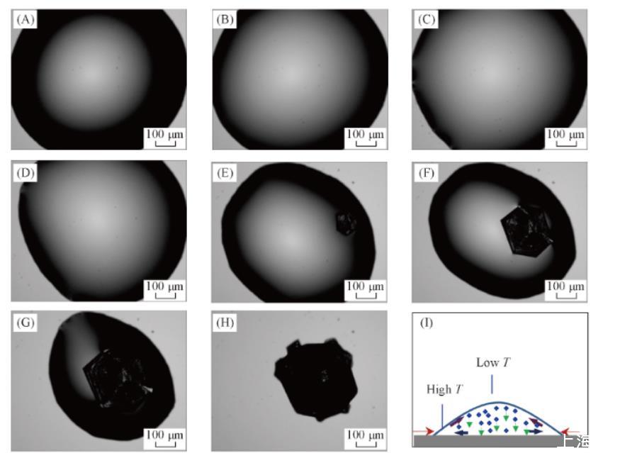 實(shí)驗(yàn)發(fā)現(xiàn),純水液滴和NaCl水溶液液滴在玻璃基底上蒸發(fā)時(shí)其三相接觸線均發(fā)生不同程度的收縮。圖1所示為NaCl溶液液滴的蒸發(fā)過程。可以看出,接觸線的收縮并非連續(xù)不斷,而是在一定時(shí)間內(nèi)先保持“釘扎”[圖1(A),(B)].在此過程中,接觸角不斷減小,從而使得表面張力的水平分力增大,當(dāng)其超越基底對接觸線產(chǎn)生釘扎作用時(shí),就會引起接觸線的收縮。由于基底結(jié)構(gòu)的不均勻性,液滴各方向的收縮也可能是不均勻的,如圖1(C)——(H)所示。由于蒸發(fā)過程中接觸線不能釘扎,蒸發(fā)造成的Marangoni對流以及重力沉降作用使得NaCl在液滴中心區(qū)域富集,如圖1(I)所示。因而NaCl晶體首先在液滴中心區(qū)域析出。