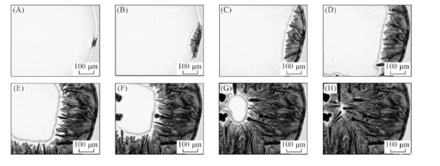 當(dāng)液滴中NaCl含量較高時(shí),鹽并不是在液滴的邊緣析出,而是在靠近邊緣的位置析出。這可能是液滴蒸發(fā)初期毛細(xì)補(bǔ)償流與Marangoni對流的競爭使得溶質(zhì)在近邊緣位置富集所致。此時(shí),液滴邊緣已成為凝膠區(qū)(表面張力小),而內(nèi)部仍為液態(tài)區(qū),因而析出的NaCl晶體將在內(nèi)部液相表面張力的牽引下向內(nèi)部運(yùn)動,并逐漸形成更大尺寸的塊狀鹽晶體。說明當(dāng)NaCl濃度較高時(shí),即使存在PTFE顆粒,仍有部分NaCl會按其自身生長特性形成多面體結(jié)構(gòu)。而液滴邊緣凝膠區(qū)枝晶的生長則與圖2相類似,呈現(xiàn)出NaCl與膠體顆粒之間復(fù)雜耦合的特點(diǎn)。