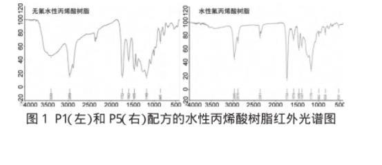 為了表征含氟丙烯酸酯單體是否已經(jīng)有效成為合成樹脂的一份子,我們對P1(不含氟的水性丙烯酸樹脂)和P5(水性氟丙烯酸樹脂)進行了紅外光譜分析(圖1)。