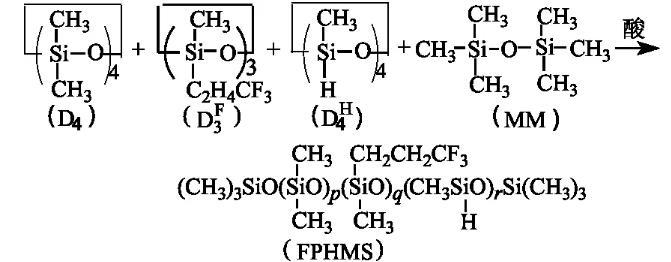 在裝有攪拌器、溫度計、回流冷凝管的四口燒瓶中,按n(D4)∶n(D3F)∶n(D4H)∶n(MM)=1∶1∶1∶1比例依次加入D4、D3F、D4H、MM,攪拌下加熱升溫至50——60℃,緩慢加入濃H2SO4(占單體總的質量分數3%),控溫在50——60℃反應4 h.后升溫至80——90℃,加適量Na2CO3,反應數小時,使體系pH近5——6,冷卻,靜置,抽濾,得無色透明液體,即中間體含氟含氫聚硅氧烷(FPHMS),其含Si-H基的氫質量分數為0.343%.反應式為:
