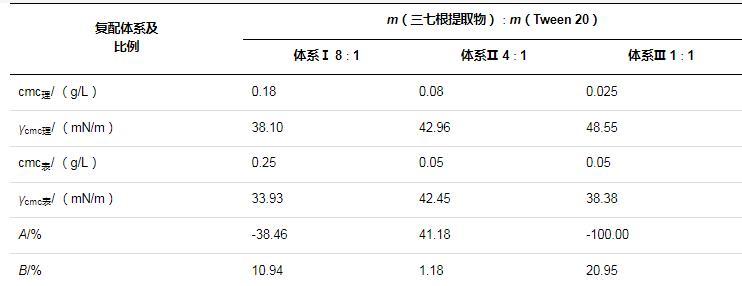 由表2可知,三七根提取物與Tween 20按不同質(zhì)量比復(fù)配后,均表現(xiàn)出一定程度的降低溶液表面張力能力增效。復(fù)配體系降低溶液表面張力的能力增效比較:體系Ⅲ>體系Ⅰ>體系Ⅱ;復(fù)配體系形成膠束的能力增效比較:體系Ⅱ>體系Ⅰ>體系Ⅲ。其中,體系Ⅱ形成膠束的能力增效41.18%,表明其形成膠束的能力較強(qiáng)。體系Ⅱ降低溶液表面張力的能力可以增效1.18%。在理論最佳復(fù)配質(zhì)量比下,復(fù)配體系cmc為0.05 g/L,γcmc為42.45 mN/m,復(fù)配增效作用比較明顯,因此選擇m(三七根提取物)∶m(Tween 20)=4∶1進(jìn)行復(fù)配。