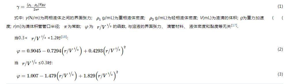 式中:γ(N/m)為兩相液體之間的界面張力;ρ1(g/mL)為重相液體密度;ρ2(g/mL)為輕相液體密度;V(mL)為液滴的體積;g為重力加速度;r(m)為滴體積管管口半徑;π為常數;φ為r/V1/3的函數,與溶液的界面張力、滴管材料、液體密度和黏度等無關。