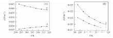 溶有萃取劑時,不同稀釋劑體系中界面張力隨溫度升高的變化趨勢明顯不同(見圖7)。首先,萃取劑的存在會使體系的界面張力明顯降低;其次,萃取劑/脂肪烴正辛烷體系的界面張力隨著溫度的升高緩慢上升;而萃取劑/芳香烴苯體系的界面張力隨著溫度的升高逐漸下降。稀釋劑種類不同時,界面張力隨溫度的變化趨勢明顯不同,反映了界面層結構受溫度影響的不同。通常情況下,加入萃取劑后,隨著溫度升高TODGA分子在界面上與水分子的結合力降低,導致其聚集濃度下降;同時,溫度的升高對TODGA分子在界面上的締合有影響,導致其締合狀態不穩定,降低其聚集濃度。這兩者均導致界面張力隨著溫度的升高而增大,并且大于溫度升高熱運動對界面分子間作用力的影響;對于芳香烴稀釋劑體系來說還存在另一個重要影響因素,即苯環上π鍵的存在。隨著溫度的升高,苯環上π鍵與界面萃取劑分子上極性基團間的相互作用被破壞,使TODGA活度增大,進而增大了TODGA在界面上的聚集濃度,使得界面張力降低。相比較而言,芳香烴作稀釋劑時溫度升高對苯環上π鍵與萃取劑分子間相互作用的影響明顯大于其對前兩者的作用。