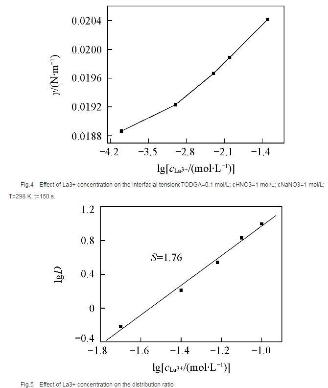在相同水相條件下,測定了萃取劑濃度對分配比的影響(圖5),根據斜率法得到萃合物的組成為La(NO3)3·2TODGA.位于界面區域的萃取劑與金屬離子形成萃合物,界面區域游離萃取劑分子減少,導致體系的界面張力增大。