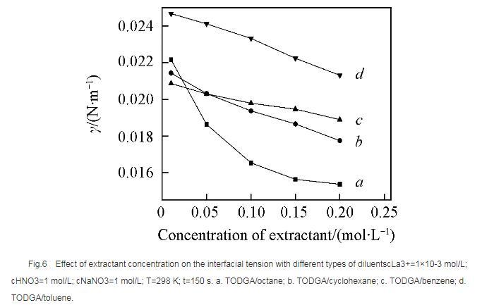 采用滴體積法考察了TODGA/HNO3體系萃取La3+的相關界面性質,在實驗條件下加入TODGA后,隨著液滴形成時間的延長,體系界面張力逐漸降低,當時間延長至約為120 s時,界面張力基本趨于不變,界面吸附達到平衡,可以認為此時已達萃取平衡。界面張力隨著La3+濃度的增大而逐漸升高,可以認為是生成的萃合物進入到界面區域的速度大于萃取劑分子擴散到界面區域的速度,降低了界面區域萃取劑濃度所致;還說明萃取劑分子向界面的擴散可能為該反應的控速步驟。稀釋劑種類不同,兩相界面物理狀況不同,萃取劑的界面活性按正辛烷>環己烷>苯>甲苯的次序降低。苯環π鍵與萃取劑分子的相互作用使芳烴體系中萃取劑界面活性降低。對于純稀釋劑/水體系,界面張力隨著溫度的升高而減小,隨著萃取劑的加入界面張力整體下降。在脂肪烴正辛烷中,界面張力隨著溫度的升高而緩慢增大,而在芳香烴苯中,界面張力隨著溫度的升高而減小。由于TODGA對HNO3萃取后的質子化作用,導致界面張力隨著硝酸濃度的升高而減小; NaNO3濃度的增大降低了界面上游離萃取劑分子的濃度,使界面張力呈增大趨勢。