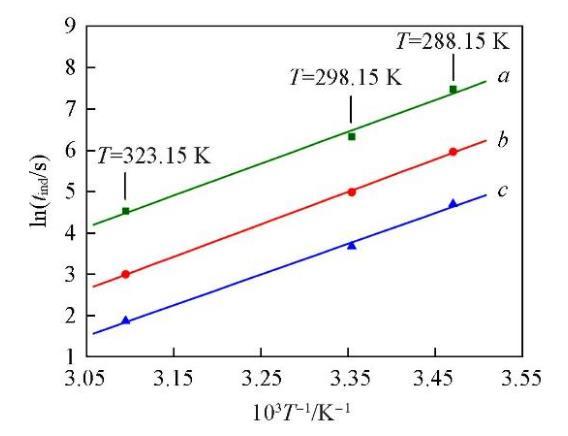 將圖1與圖4對比可知,添加NaCl后Li2CO3的成核誘導期明顯增長,說明體系中過量Cl?的存在抑制了Li2CO3的成核.用圖4中的實驗數據回歸了式(8)中的參數數值,結果列于表3.由回歸的參數數值可知,過飽和度對誘導期的影響仍然是在較低的溫度下更為顯著.