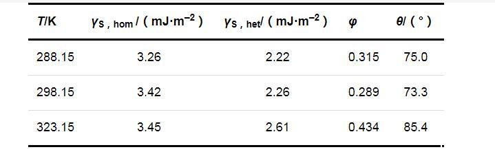 兩種成核機制時的固-液界面張力(γS,hom和γS,het)、形狀因子(φ)和接觸角(θ)的計算結果列于表2.可以看出,在同一溫度下,均相成核時的固-液界面張力大于非均相成核時的固-液界面張力;溫度對固-液界面張力的影響并不明顯,固-液界面張力只隨溫度的升高略有增加.