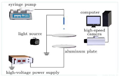 在本實驗中,將兩塊直徑為10cm的圓形鋁板沿著垂直方向放置,其間隔固定為20mm。在上極板中心位置開一個直徑為5mm的孔口,以便液滴從上極板上方滴落,穿過上極板與下極板發(fā)生撞擊行為。為了實現(xiàn)垂直電場的形成,將高壓直流電源與下極板相連,上極板作接地處理,這樣的結(jié)構(gòu)產(chǎn)生了一個垂直電場和一個帶電的基底。此外,不銹鋼針管(G24,外徑0.55m,內(nèi)徑0.27mm)通過毛細(xì)管連接到微流注射泵上,使液滴以恒定的撞擊速度滴落到下極板。為了消除靜電對實驗的影響,將針管作接地處理,確保液滴在進(jìn)入電場之前不攜帶任何感應(yīng)電荷。