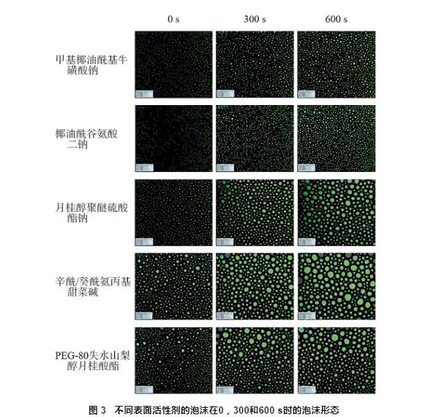 圖3不同表面活性劑的泡沫在0,300和600 s時的泡沫形態(tài)