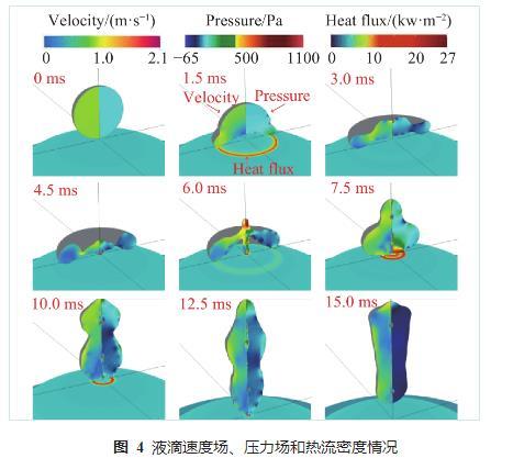 從圖中可以看出,0 ms時,液滴開始接觸壁面,液滴主要在慣性力作用下沿球表面快速鋪展,受球面形狀的影響,重力對液滴的鋪展起到一定作用,液滴通過克服黏性損失和液滴變形將動能轉(zhuǎn)化為表面能;1.5 ms時,由于蒸汽積壓,液滴底部呈扁平狀,此時氣膜較薄,底部球面上存在熱流密度明顯較大的環(huán)狀區(qū)域,同時液滴運動方向由軸向開始轉(zhuǎn)變?yōu)閺较颍?.0 ms時,隨著液滴繼續(xù)鋪展,流體向液滴前端積聚,徑向速度與壓力都開始減小,同時,液滴下方蒸汽流出后,周圍空氣沿球面流向液滴底部,形成回流;4.5 ms時,液滴達(dá)到最大鋪展,隨后,在表面張力的作用下開始收縮,外部環(huán)狀區(qū)域壓力與速度都較小,中心點處氣膜較薄,具有較高的熱流密度,同時,因為液滴形成了中間低四周高的結(jié)構(gòu),周圍氣流形成多個渦流;6.0 ms時,液滴逐漸收縮,外側(cè)速度與壓力明顯小于中心內(nèi)部,且液滴運動方向由原來的周向變?yōu)檩S向,中心區(qū)域與外側(cè)氣膜厚度都較薄,且中心區(qū)域更薄,因此熱流密度更大,多個渦流都在遠(yuǎn)離液滴;7.5 ms時,液滴進(jìn)一步收縮,外側(cè)速度與壓力都在升高,軸向方向速度減弱,由于液滴底部氣膜厚度不均勻,導(dǎo)致球面熱流密度分布呈多環(huán)形,不同區(qū)域差異較大,同時,因為液滴底部壓力較高,對底部氣膜擠壓作用較強,使氣流逸散速度進(jìn)一步提高;9.0 ms-13.0 ms階段,液滴逐漸脫離壁面,壁面熱流密度隨之減小,直到液滴完全脫離壁面,周圍氣流在液滴的帶動下逐漸沿軸向遠(yuǎn)離球面,壁面附近氣流速度逐漸減小。
