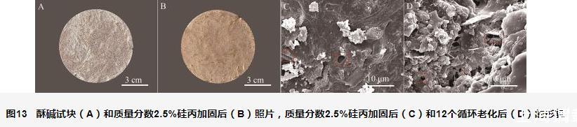 酥堿試塊(圖13A)經(jīng)硅丙乳液修復(fù)后再進(jìn)行濕熱老化12個(gè)循環(huán),肉眼觀察發(fā)現(xiàn)加固后的試塊(圖13B)表面無酥堿等病害。此外,對(duì)加固后以及12次循環(huán)老化后的試塊進(jìn)行SEM分析。從圖13C可以看出,修復(fù)加固后試塊內(nèi)部能看到明顯的成膜現(xiàn)象,說明硅丙乳液滲透加固性較好;而老化12個(gè)循環(huán)后(圖13D),成膜現(xiàn)象仍然存在,進(jìn)一步證明硅丙乳液具有較強(qiáng)的收縮性和耐老化性。因而可以將其作為性能優(yōu)異的膠結(jié)材料用于酥堿壁畫的修復(fù)中。