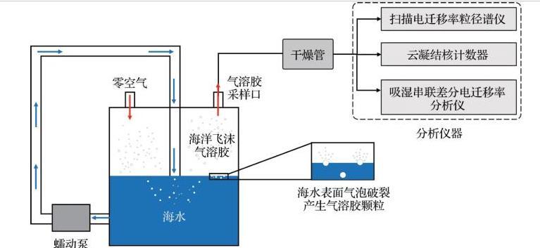 SSA生成裝置能夠在實驗室環(huán)境中模擬自然海洋系統(tǒng),實現(xiàn)在受控條件下從天然海水中產(chǎn)生SSA,并結(jié)合儀器表征顆粒的粒徑分布和理化特性。目前常用的模擬裝置有鼓泡式發(fā)生器、射流式發(fā)生器及波浪破碎式發(fā)生器等。本文以射流式SSA發(fā)生器為例,介紹SSA的生成原理(圖2)。通常來說,發(fā)生器都具有進(jìn)水口、進(jìn)氣口和采樣口。利用蠕動泵將海水從發(fā)生器底部周期性循環(huán)到頂部噴嘴,形成一個俯沖射流水柱,撞擊水面并將空氣夾帶進(jìn)入海水中,在水下一定深度產(chǎn)生氣泡羽流。當(dāng)氣泡上升到水氣界面并破裂時,產(chǎn)生SSA顆粒。采用潔凈零空氣作為載氣,將生成的SSA顆粒通過氣溶膠采樣口進(jìn)行采集,連接干燥管進(jìn)行干燥。此后,使用掃描電遷移率粒徑譜儀測量SSA的粒徑分布和數(shù)濃度等。該裝置可連接其他儀器,如CCN計數(shù)器和吸濕串聯(lián)差分電遷移率分析儀等進(jìn)行CCN活性及吸濕性等的表征。