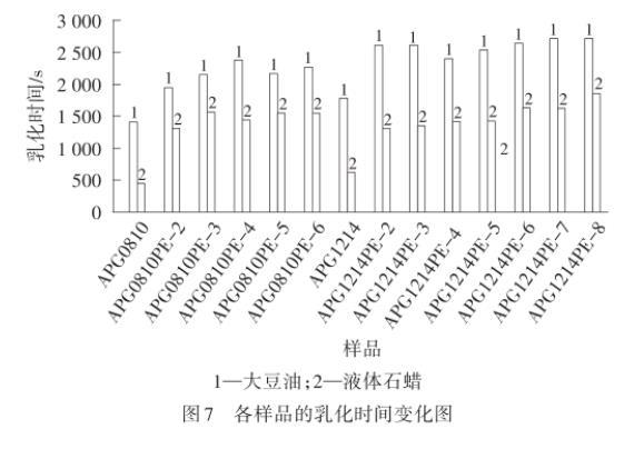 由圖7可以看出,采用乳液破乳時間表征表面活性劑的油水界面性質,APG1214和APG1214PE-m乳化大豆油以及液體石蠟的能力勝于APG0810以及APG0810PE-n,而且隨著PO加合數的增加而提高。這是由于PO基團和烷基鏈增長提供了疏水性,增強了乳化劑分子的乳化能力,延長了破乳時間。此外,所有表面活性劑乳化大豆油的能力均明顯強于乳化液體石蠟,表明PO基團可能具有類似極性作用,可以增強樣品與極性分子之間的協(xié)同作用,因此乳化性能更好。