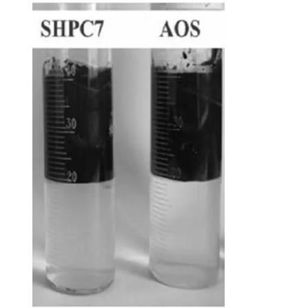 為驗證SHPC7活性劑與其他表面活性劑的性能,通過乳化實驗對SHPC7活性劑與AOS活性劑在乳化方面的乳化性能進(jìn)行觀察,從而可以得到如圖3的實驗前后效果。