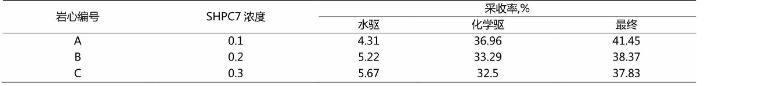 由此,通過表2看出,在增大SHPC7表明活性劑的濃度下,其驅(qū)油效果在不斷增加。但是在0.3%的濃度下其驅(qū)油采收率小于濃度為0.2%的采收率。根據(jù)上述的結(jié)果得出,在實際的應(yīng)用中,應(yīng)選擇SHPC7表明活性劑濃度大小為0.2%的濃度,此時采收率最高。