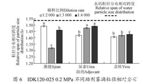 該試驗條件下霧滴體積中徑相對分布如圖5所示,從圖中可以看出:加入助劑后,溶液的霧滴體積中徑均高于自來水,同時3種助劑溶液霧滴粒徑相對分布跨度Δs受溶液配比因素影響程度不同。該條件下自來水的粒徑分布相對跨度為1.344。激健溶液受影響程度最顯著,1:2 000配比條件下激健溶液粒徑分布相對跨度最大,粒徑分布相對跨度為1.469,相比于水增加9.29%,1:3 000配比條件下粒徑分布相對跨度為1.408,相比于水增大4.73%,相差近5%。意歐溶液受影響程度最小,1:3 000配比條件下意歐溶液粒徑分布相對跨度為1.365,相比水僅增加1.56%,1:4 000配比條件下相比于水增大2.31%,相差不足1%。尿素溶液在1:3 000配比條件下,粒徑分布相對跨度為1.429,相比于水增加6.33%,霧滴粒徑一致性減弱。