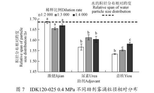 3)IDK120-025型噴頭,0.4 MPa壓力下。激健在配比1:3 000條件下,相比于自來水霧滴體積中徑增大20.43%,霧滴粒徑相對分布跨度減小1.74%。尿素與意歐溶液在配比1:2 000條件下,相比于自來水霧滴體積中徑分別增大16.92%、11.10%,霧滴粒徑相對分布跨度分別減小6.92%、8.86%,在增大霧滴體積中徑的同時(shí)有效改善霧滴分布質(zhì)量,增大霧滴飄移可控性。