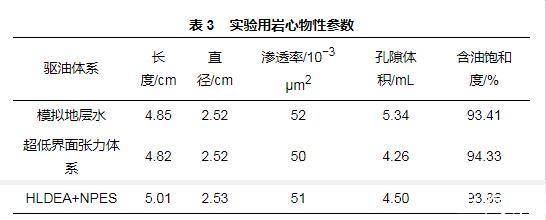 通過巖心動態驅替實驗評價體系提高采收率的能力,實驗裝置見圖1。采用不間斷驅油的方式,以0.3 mL/min的注入流量驅油。分別考查模擬地層水、HLDEA+NPES體系和超低界面張力體系的驅油性能。實驗用巖心物性參數見表3。實驗的具體步驟如下。