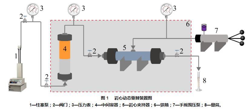 1—柱塞泵;2—閥門;3—壓力表;4—中間容器;5—巖心夾持器;6—烘箱;7—手搖圍壓泵;8—量筒。
