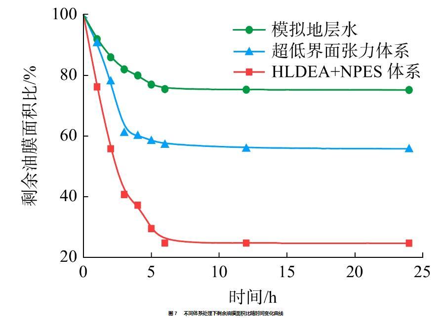 2)HLDEA+NPES體系可將油水界面張力降低至3.8×10?3 mN/m,水下油滴接觸角由41.34°增加至162.53°,使得24 h內(nèi)油膜剝離率高達(dá)75.3%。