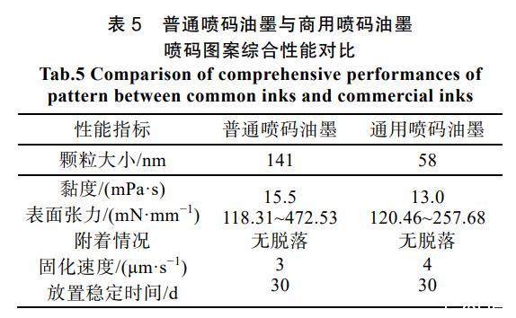 進一步對2種油墨的噴碼及圖案綜合性能對比,結果如表5所示。可以看到:在固體顆粒大小以及流體黏度上,本通用油墨具有顯著優勢;在2種承印紙張上分別進行噴碼,本通用油墨具有更小及更窄的表面張力分布。隨后使用3M長膠帶對噴碼圖案表面進行反復黏接,2種噴碼油墨的圖案均無墨跡脫落,體現出優秀的附著力。最后,將圖案樣品均放置30 d,所有噴碼圖案均未出現形變、褪色和毛邊,證明具有良好的穩定性。