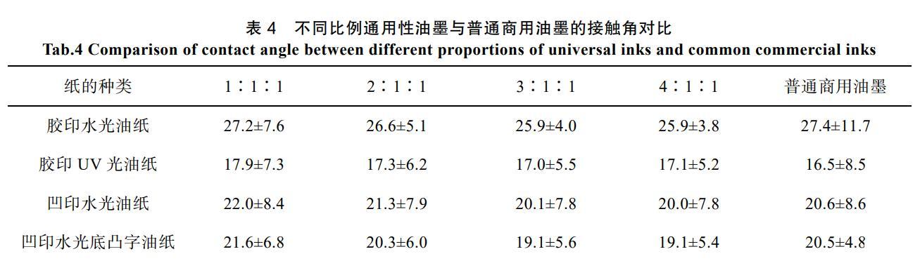 表4不同比例通用性油墨與普通商用油墨的接觸角對比