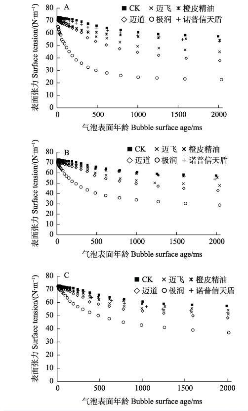 2.2不同助劑對(duì)乙基多殺菌素藥液動(dòng)態(tài)表面張力的影響