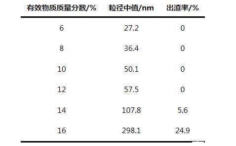 由表2可知,隨著CR-3有效含量的增加,聚合物分子粒徑中值逐漸增大,當有效物質質量分數達到14%時,粒徑中值和出渣率明顯增加。這是因為當膠束的大小和數量一定時,隨著反應單體進入膠束的數量增多,共聚后分子尺寸逐漸增大,當聚合物分子的粒徑和數量大于膠束承受的上限時,膠束穩定性降低,聚合物從乳液中析出形成沉淀。因較大的粒徑中值除油效果較優,綜合考慮,選擇產品的有效物質質量分數為12%。