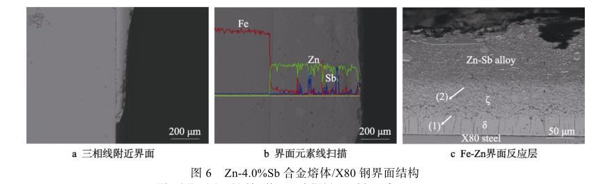 圖6c展示了經(jīng)硝酸酒精腐蝕后,Zn-Sb合金與X80鋼潤濕的界面反應產物層。利用EDS沿界面進行定量檢測,發(fā)現(xiàn)界面處存在一定量的Zn、Fe和極少量的Sb,Zn-Sb合金熔體與X80鋼發(fā)生反應生成了鐵鋅化合物。能譜分析表明,圖6c中箭頭所示(1)、(2)處的含鐵量分別為8.30%和5.23%,為典型的δ(FeZn10)相和ζ(FeZn13)相,ζ層緊鄰Zn-Sb合金熔體,而δ層呈柵狀,位于ζ層的下方,這與徐其林等的研究結果一致。同時發(fā)現(xiàn),隨著Sb含量的增加,潤濕反應所形成的界面產物層并未發(fā)生顯著變化,說明Sb元素的添加對Fe-Zn反應基本沒有影響。