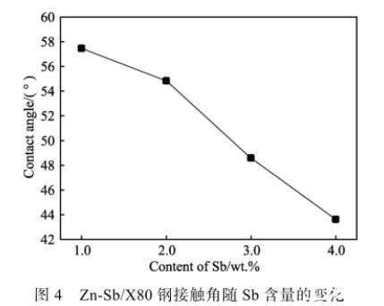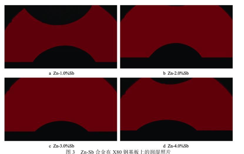 通常在基板沒有氧化的情況下,無論金屬/金屬體系之間是否存在界面反應,合金熔體與金屬基板之間總會潤濕,液態(tài)金屬與金屬基板之間的潤濕程度常用接觸角(θ)來度量,接觸角越小說明體系潤濕性越好。圖3為實驗條件下Zn-Sb合金熔體在X80鋼上的潤濕照片,不同Sb含量對鋅液與X80鋼基板間接觸角的影響如圖4所示。實驗結果表明,鋅液中添加少量Sb能有效改善其與X80鋼間的潤濕性。可以看出,Zn-Sb/X80鋼接觸角隨Sb含量的增加而不斷減小,當Sb的質量分數(shù)為1.0%時,接觸角為57°左右;Sb的質量分數(shù)為4.0%時,接觸角達到最小,約為43°,此時潤濕效果最好。