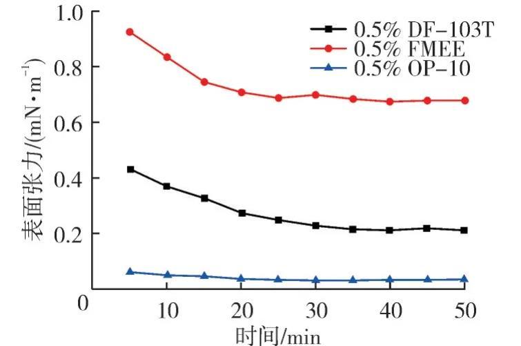 測定0.5%的DF-103T、OP-10、FMEE這3種非離子表面活性劑的表面張力,結(jié)果見圖2。