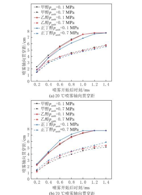 環(huán)境溫度升高至70℃、120℃時(shí),正如圖8(b)和圖8(c)呈現(xiàn)出的,正丁醇的噴霧軸向貫穿距高于甲醇和乙醇,這與常溫常壓的環(huán)境條件下完全相反。盡管正丁醇的潛熱較低,但環(huán)境溫度和壓力的升高使甲醇和乙醇的過熱度高于正丁醇,進(jìn)而引發(fā)更高的顯熱,提升了甲醇和乙醇的蒸發(fā)率,導(dǎo)致醇束發(fā)展緩慢。