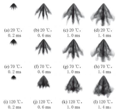 圖4不同環(huán)境溫度和噴霧開始后時(shí)刻下甲醇的噴霧形態(tài)