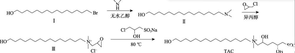 本文擬以15-溴-1-十五醇、二甲胺水溶液、環(huán)氧氯丙烷、3-氯-2-羥基丙磺酸鈉為原料,通過(guò)季銨化反應(yīng)和開環(huán)反應(yīng)制備了甜菜堿表面活性劑(TAC)。通過(guò)聚合物和表面活性劑分子的疏水單元組成的混合膠束與聚合物主鏈發(fā)生物理交聯(lián),從而產(chǎn)生擴(kuò)展的聚合物網(wǎng)絡(luò),以期改善稠化酸的耐溫、耐剪切性能,提高180℃高溫地層的油氣采收率。