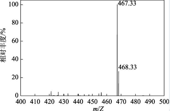 圖4為TAC的MS譜圖。從圖4可以看出,在正離子檢測模式下檢測到最大豐度的質(zhì)譜信號(hào)為m/Z=467.33,m/Z=468.33為[M+1],即正峰MS信號(hào)。TAC相對(duì)分子質(zhì)量測量值與計(jì)算值一致。