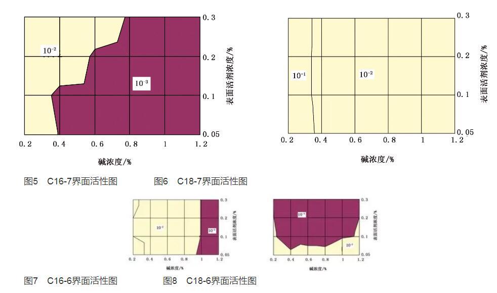 1)碳鏈長(zhǎng)度對(duì)界面活性的影響對(duì)用濃度為1500mg/L的聚合物和不同碳鏈長(zhǎng)度的烷基苯磺酸鹽配置的弱堿三元復(fù)合體系進(jìn)行界面活性檢測(cè)(見(jiàn)圖5~圖8)。圖5和圖1對(duì)比表明,帶有支鏈的C16烷基苯磺酸鹽形成超低界面張力時(shí)堿濃度和表面活性劑濃度范圍較寬;圖6和圖4對(duì)比表明,帶有支鏈的C18烷基苯磺酸鹽在相同濃度范圍內(nèi)沒(méi)有形成超低界面張力。因此,帶有支鏈的C16烷基苯磺酸鹽界面活性好于帶有支鏈的C18烷基苯磺酸鹽。