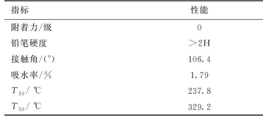 由表1可見,含氟聚氨酯固化膜和玻璃基材之間的附著力達到0級,鉛筆硬度大于2H。FPU薄膜與水的靜態接觸角為106.4°,遠高于不含氟的聚氨酯膜。本研究的FPU薄膜在浸泡24 h后吸水率趨于平衡,泡水200 h后吸水率不高于1.79%,遠低于一般的聚氨酯的5%吸水率。歸因于C—F鏈段具有很低的表面張力,會自發地向表面遷移并富集,降低了表面張力,提高了材料的憎水性。除此之外,從表1中還可知FPU的T10和T50分別為237.8和329.2℃。與一般聚氨酯材料相比,FPU的熱穩定性沒有很大程度的提升。