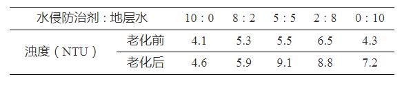 將水侵防治劑與地層水按不同比例(體積比)混合,測定其濁度值,并將其在80℃下放置4 h后,繼續(xù)測定其濁度值變化情況,以此考察水侵防治劑與地層水的配伍性,結(jié)果見表2。可以看出,水侵防治劑的自身濁度較低(僅為4.1NTU),并且其與地層水按不同比例混合后的濁度值均未明顯增大,在80℃下老化4 h后濁度值也仍小于10NTU,說明水侵防治劑與地層水具有良好的配伍性。