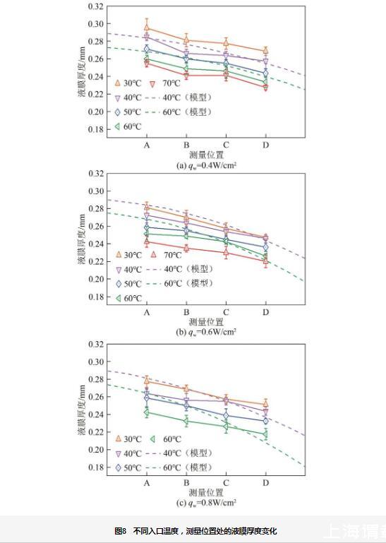 圖8不同入口溫度,測(cè)量位置處的液膜厚度變化