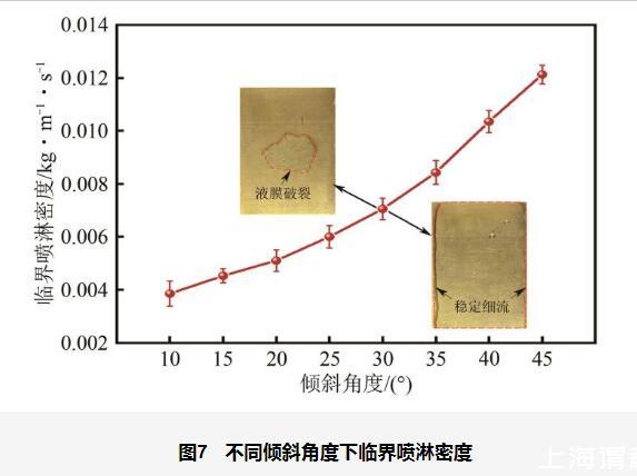 從圖7中可以看出,在較低的傾斜角度(如10°~25°)下,液膜受重力在壁面平行方向分量的影響較小,主要依靠噴淋液體的動(dòng)能和潤(rùn)濕性來維持覆蓋。此時(shí),液膜較厚,表面張力對(duì)毛細(xì)波動(dòng)的抑制作用較強(qiáng),能夠有效抵御擾動(dòng),流動(dòng)較為穩(wěn)定,因此臨界噴淋密度較低。然而,在較高的傾斜角度(如30°~45°)下,重力在流動(dòng)方向的分量顯著增強(qiáng),液膜受到更大的重力驅(qū)動(dòng)力作用,易發(fā)生滑移和局部脫離壁面現(xiàn)象。同時(shí),傾斜角度增大會(huì)使液膜變薄,液膜內(nèi)剪切力增大,進(jìn)一步放大表面張力波動(dòng)對(duì)擾動(dòng)的響應(yīng),從而導(dǎo)致液膜對(duì)擾動(dòng)的敏感性提高,流動(dòng)不穩(wěn)定性顯著增強(qiáng)。此外,局部區(qū)域的液膜破裂會(huì)導(dǎo)致液膜整體失穩(wěn),最終在兩側(cè)形成穩(wěn)定細(xì)流。因此,為了維持液膜的完整性和連續(xù)性,需要提高噴淋密度以抵消重力和表面張力波動(dòng)的破壞作用,從而導(dǎo)致臨界噴淋密度在高傾斜角度下顯著升高。