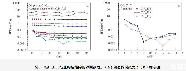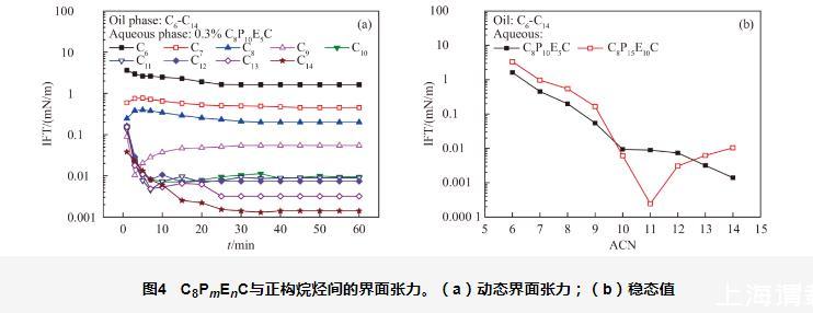圖5 C8PmEnS與正構(gòu)烷烴間的界面張力。(a)動(dòng)態(tài)界面張力;(b)穩(wěn)態(tài)值