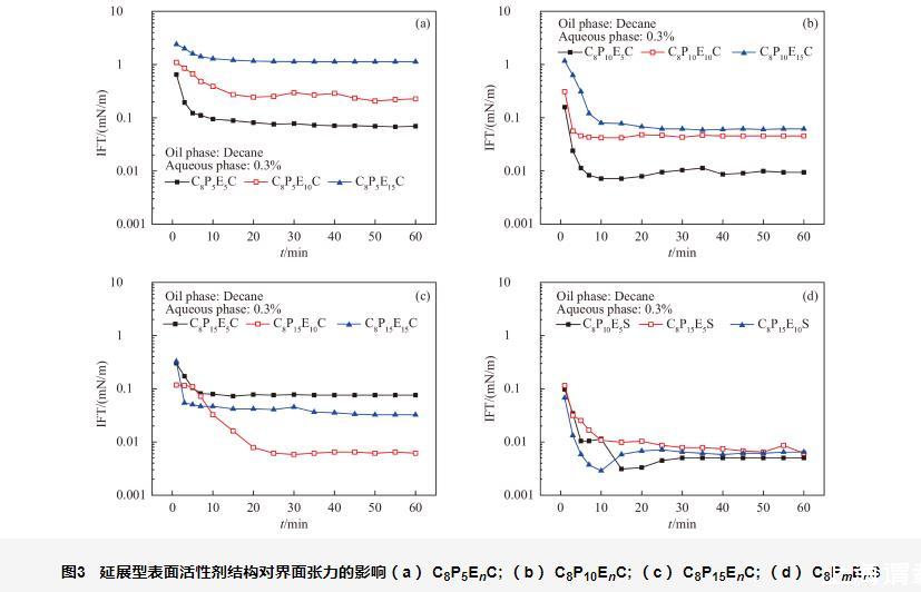 其它延展型表面活性劑溶液界面張力隨質(zhì)量分?jǐn)?shù)的變化趨勢(shì)與C8P15E10C類似,不再列出。因此,選擇溶液質(zhì)量分?jǐn)?shù)為0.3%進(jìn)行后續(xù)的結(jié)構(gòu)-活性關(guān)系研究。