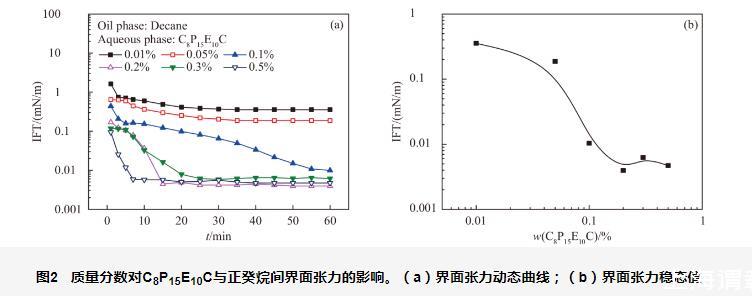 圖2質(zhì)量分?jǐn)?shù)對(duì)C8P15E10C與正癸烷間界面張力的影響。(a)界面張力動(dòng)態(tài)曲線;(b)界面張力穩(wěn)態(tài)值