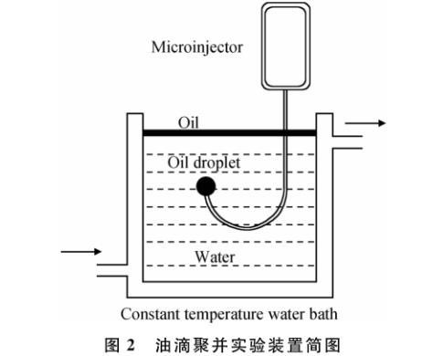 以甲苯與正庚烷(體積比為1/1)為溶劑,將不同原油組分配制成為質量分數1%的溶液作為油相,以模擬殘余HMPAM溶液為水相,利用如圖2所示的實驗裝置:由微量注射泵、彎鉤以及可加熱水槽組成,開展油滴聚并實驗以評價液滴穩定性(或界面穩定性)。利用微量注射泵(可間斷注射)通過彎鉤注射30個30μL的油滴,由于密度差的原因,油滴會在樣品池中上?。辉跇悠烦厣蠈佑幸粚佑拖?,油滴上浮碰到油相時開始計時,當油滴完全和油相融合時停止計時,這一段時間可以定義為油滴的聚并時間;這期間的過程利用快速攝像錄下,然后分楨計算后,得到所需聚并時間。