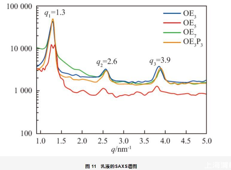 對乳液進行了SAXS測試,結果如圖11所示。由圖可知,4種乳液的SAXS譜圖中都出現了3組衍射峰,且q1∶q2∶q3滿足1∶2∶3,進一步證明了乳液的層狀液晶結構,q2處明顯的衍射峰表明液晶結構的長程有序,使乳液不容易發生結塊或絮凝等,起到穩定乳液的作用。另外,以OE5為乳化劑制備的乳液的SAXS譜圖中出現了很多毛刺,說明樣品的有序性較差。